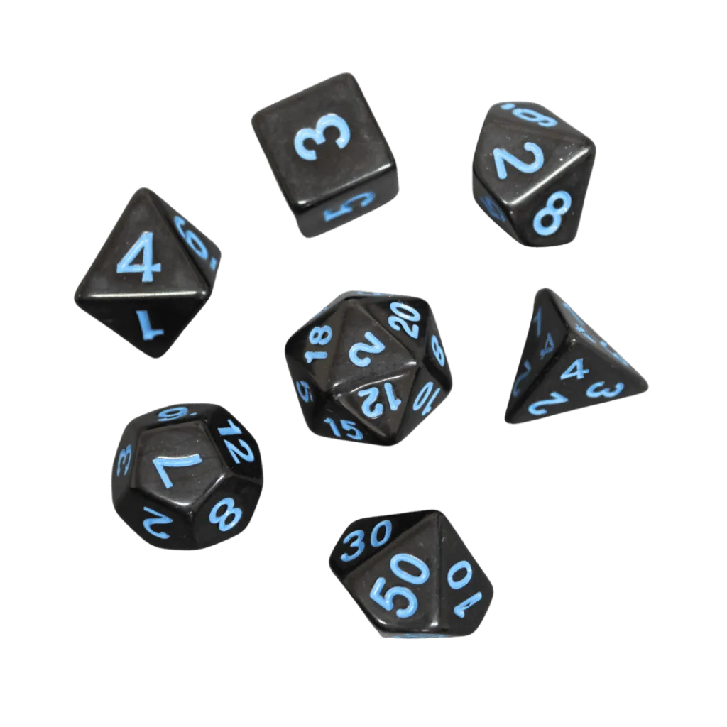 Midnight Black and Neon Blue Marbled DND Dice Set, 7 Piece Dice Set, Roll Playing Game Dice with Dice Bag